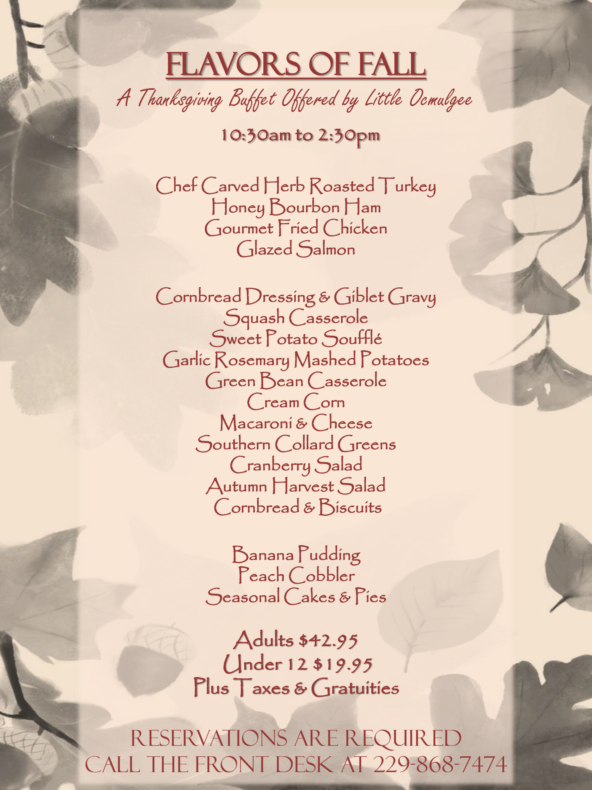 Reservations are required. Call the Front Desk at 229-868-7474 to reserve your table today!